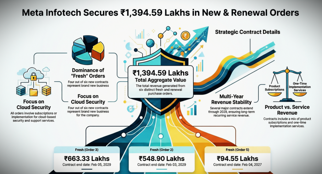 On February 3, 2026, Meta Infotech Ltd officially informed the Stock Exchange (BSE) that it had secured a significant aggregate of new and renewal work orders totaling Rs. 1,394.59 Lakhs.